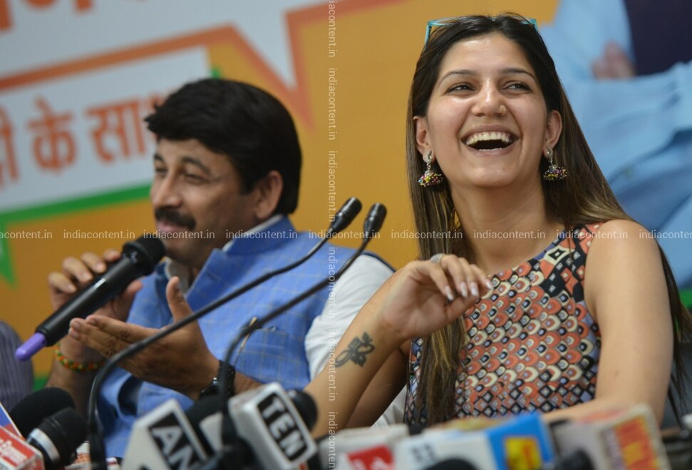 NEW DELHI INDIA JULY 08 Delhi BJP President Manoj Tiwari and Singer Dancer Sapna Chaudhary clicked during Media Interaction in New Delhi. Photo by K Asif India Today Group Manoj Tiwari Sapna Chaudhary