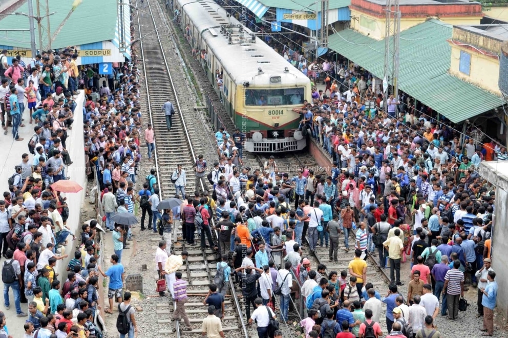 Sealdah People block train movement at Sodepur station on the Sealdah main line section as they stage a demonstration followed by Eastern Railways's notification over trains running late in Sealdah West Bengal on Sept 8 2018. Railway services remained affected for three hours due to the demonstration. The notification had stated that trains were running late due to the ongoing non interlocking work for commissioning of an automatic signalling system between Barrackpur and Ichapur. The work started on September 7 and will end on September 10. Photo IANS