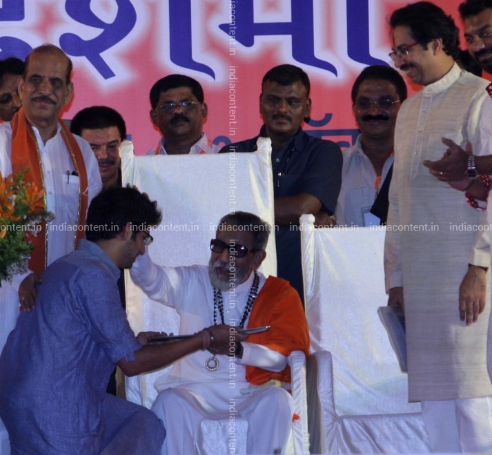 MUMBAI INDIA OCTOBER 17 Shiv Sena supremo Bal Thackeray along with his Son Udhav Thackeray and grandson Aditya Thackeray during the Dusshera rally in Mumbai on October 17 2010. Photo by Nagesh Ohal India Today Group Bal ThackerayUdhav ThackerayAditya Thackeray