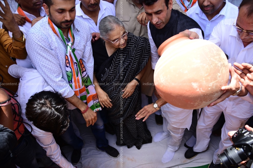 NEW DELHI INDIA JUNE 18 Delhi Pradesh Congress Committee President Sheila Dikshit clicked during a dharna against the severe power and water shortage at Sangam Vihar in New Delhi. Photo by Manish Rajput India Today Group Sheila Dikshit