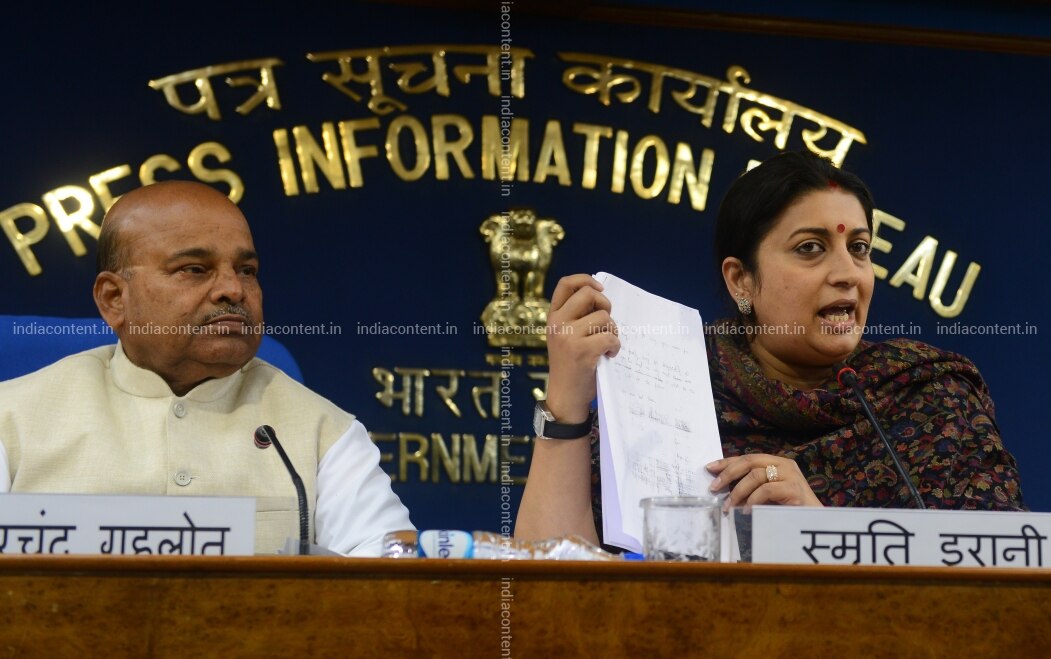 DELHI INDIA JANUARY 21 UNION HRD Minister Smriti Irani AND UNION Minister FOR Social Justice AND Empowerment Shri Thaawar Chand Gehlot addressing a press conference ON the death of Rohith Vemula a dalit student of Hyderabad University IN NEW Delhi.Photo BY Parveen Negi India Today GROUP Smriti IraniThaawar Chand Gehlot