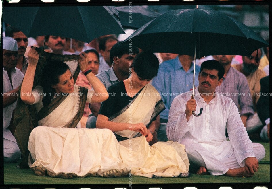 NEW DELHI INDIA AUGUST 08 Member of Lok Sabha Sonia Gandhi Indian Politician Priyanka Gandhi and Indian businessman Robert Vadra clicked at a meeting during rain in New Delhi. Photo by Dilip Banerjee India Today Group Sonia Gandhi Priyanka Gandhi Robert Vadra
