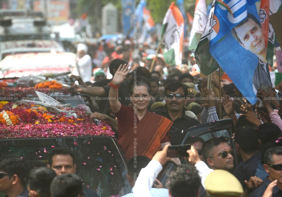 RAE BARELI UTTAR PRADESH APRIL 11 Congress party Leader Sonia Gandhi waves to the crowd as she arrives to file her nomination papers for the upcoming general elections in Rae Bareli. Photo by Pankaj Nangia India Today Group Sonia Gandhi