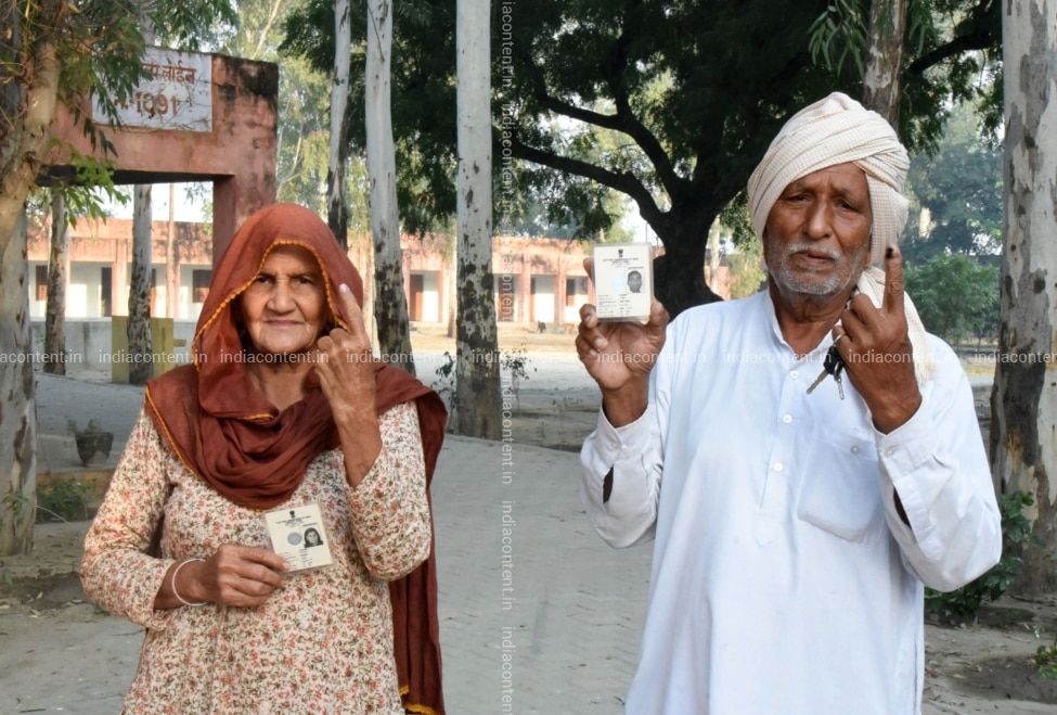 Sonipat An elderly couple voters showing mark of indelible ink after casting their votes at a polling booth during the Haryana Assembly Election at Kami Village in Ganaur Tehsil Sonipat on Oct. 21 2019. Photo PIB IANS