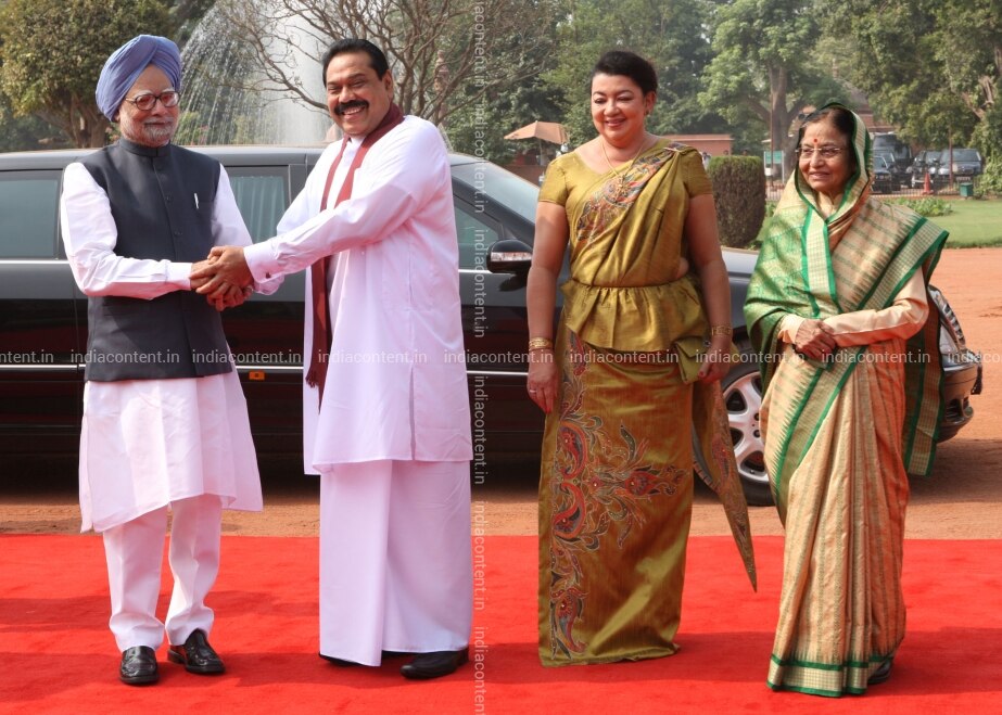 NEW DELHI INDIA JUNE 9 Sri Lankan President Mahinda Rajapaksa and his wife with President Mahinda Rajapaksaand Prime Minister Manmohan Singh at the Rashtrapati Bhawan in New Delhi on Wednesday June 9 2010.Photo by Sipra Das India Today Group Mahinda RajapaksaMahinda RajapaksaManmohan Singh