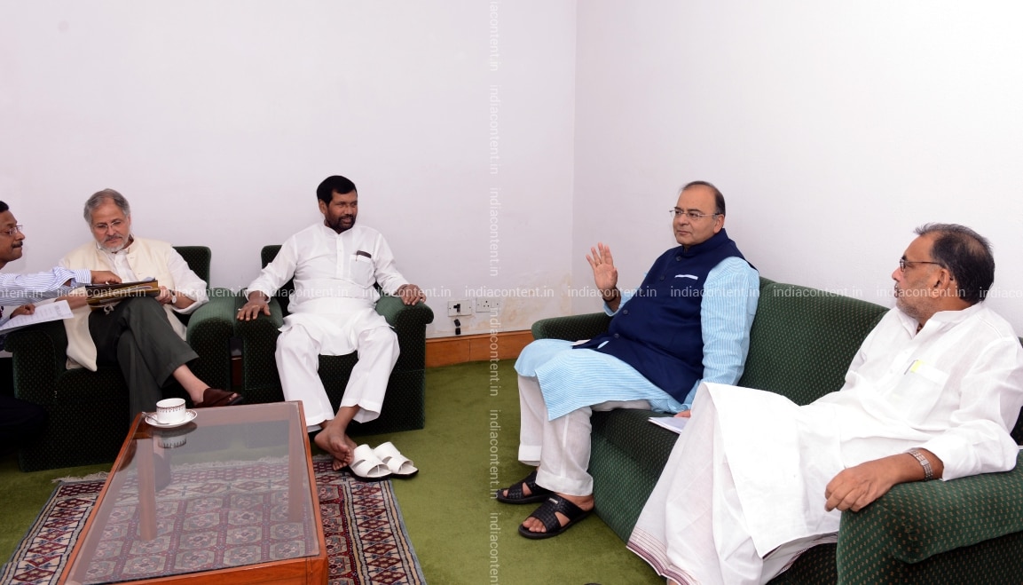 NEW DELHI INDIA JULY 04 UNION Minister FOR Finance Arun Jaitley WITH UNION Minister FOR Consumer Affairs Food AND Public Distribution Ramvilas Paswan AND Delhi Lt. Governor Najeeb Jung BEFORE the State Food Ministers Conference IN NEW Delhi.Photo BY Parveen Negi India Today GROUP Arun JaitleyRamvilas PaswanNajeeb Jung