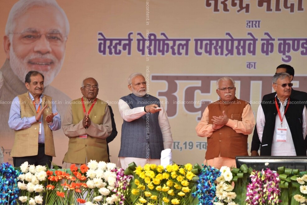 Sultanpur Prime Minister and BJP leader Narendra Modi inaugurates the Kundli Manesar Section of the Kundli Manesar Palwal KMP Western Peripheral Expressway and also inaugurated the Ballabgarh Mujesar Metro Link at Sultanpur Haryana on Nov 19 2018. Also seen Haryana Governor Satyadev Narayan Arya and Chief Minister Manohar Lal Khattar. Photo IANS