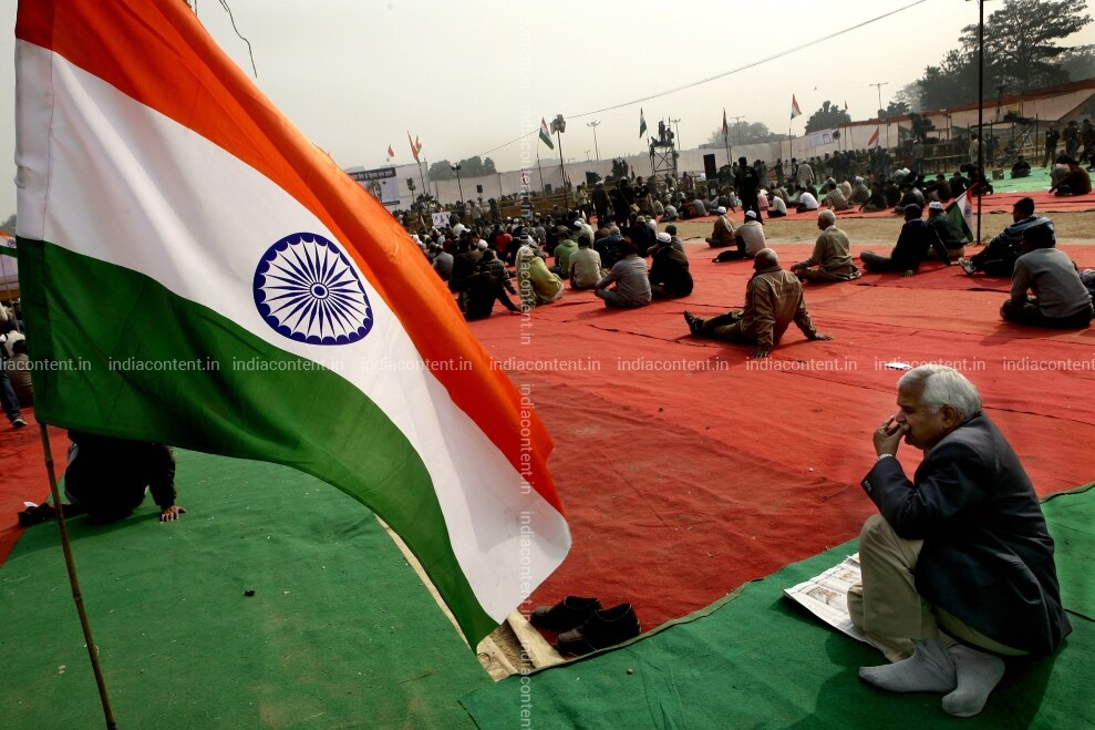 A supporter of Social Activist Anna Hazare with a national flag along with others at Ramlila ground in New Delhi Anna Hazare Anti Corruption Lokpal Bill Social Actvism