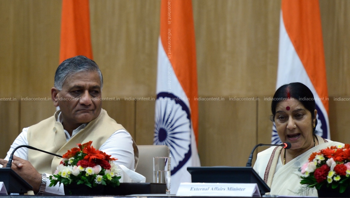 NEW DELHI INDIA SEPTEMBER 08 External Affairs Minister Sushma Swaraj AND Vijay Kumar Singh Minister of State of External Affairs AT the RELEASE of a booklet FAST Track Diplomacy ON the governments 100 days of FOREIGN policy record AT a press conference AT Jawaharlal Nehru Bhawan IN NEW Delhi.Photo BY Praveen Negi India Today GROUP Sushma SwarajVijay Kumar Singh