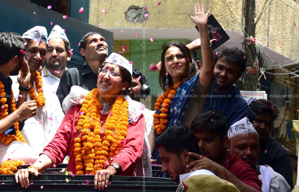 NEW DELHI INDIA MAY 07 Bollywood Actress Swara Bhaskar clicked while campaigning for Atishi Marlena at Shastri Park in New Delhi. Photo by Manish Rajput India Today Group Swara Bhaskar Atishi Marlena