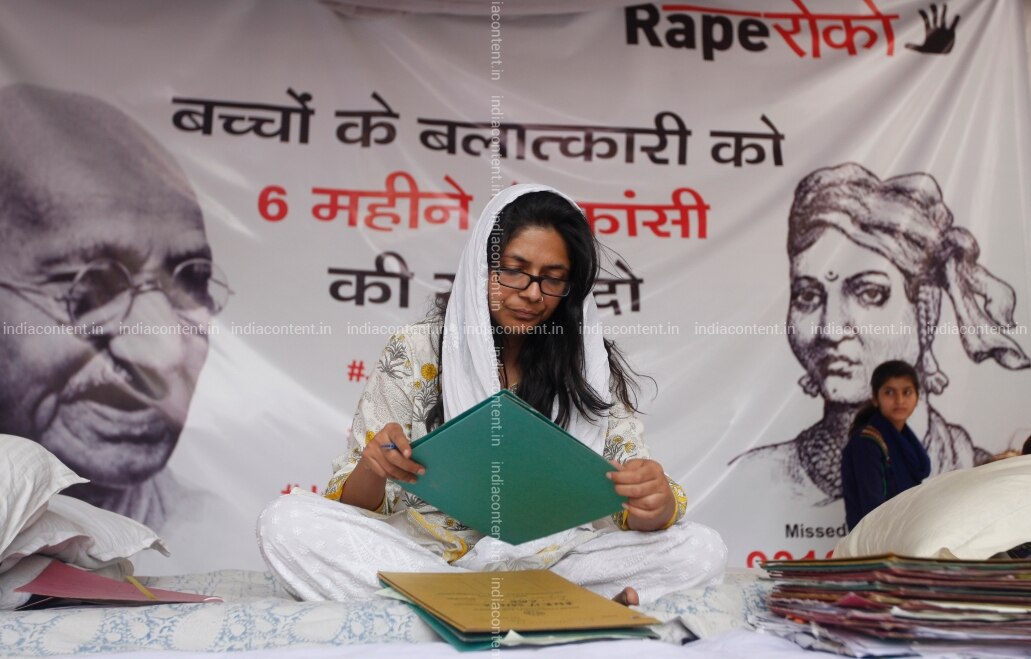 NEW DELHI INDIA APRIL 16 Delhi Commission for Women Chairperson Swati Maliwal during hunger strike aganist rape incidents at Rajghat in New Delhi. Photo by Qamar Sibtain India Today Group Swati Maliwal