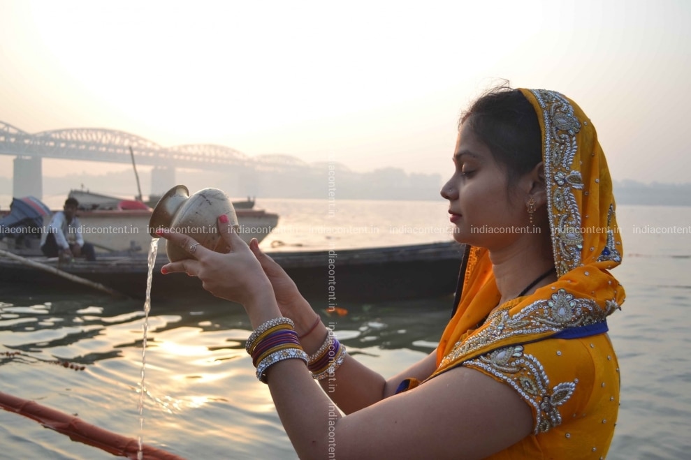 Buy Varanasi A devotee offers water to the Sun God Surya Arghya on the banks of Ganga river on the occasion of Chhath Puja in Varanasi on Nov 14 2018 Photo IANS Pictures, Images, Photos By IANS - Others pictures