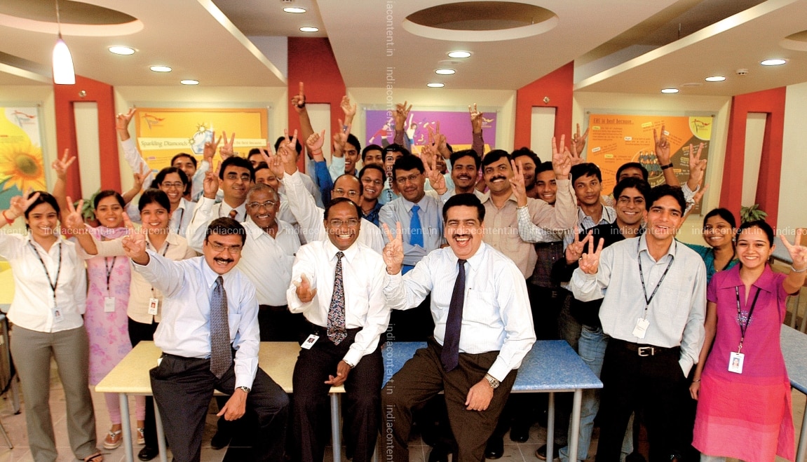 Vineet Nayar front right CEO HCL Commet poses with employees showing Victory Sign at office in Noida India