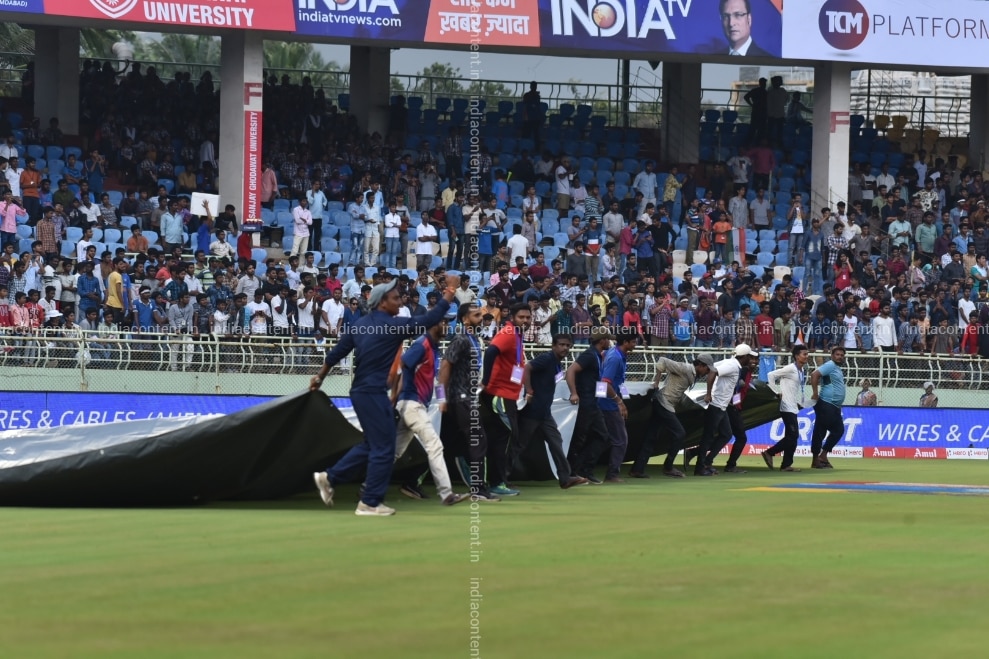 Visakhapatnam Groundsmen cover the pitch with tarpaulin sheets as rain stops the Day 1 of the 1st Test match between India and South Africa at Dr. Y.S. Rajasekhara Reddy ACA VDCA Cricket Stadium in Visakhapatnam on Oct 2 2019. Photo IANS