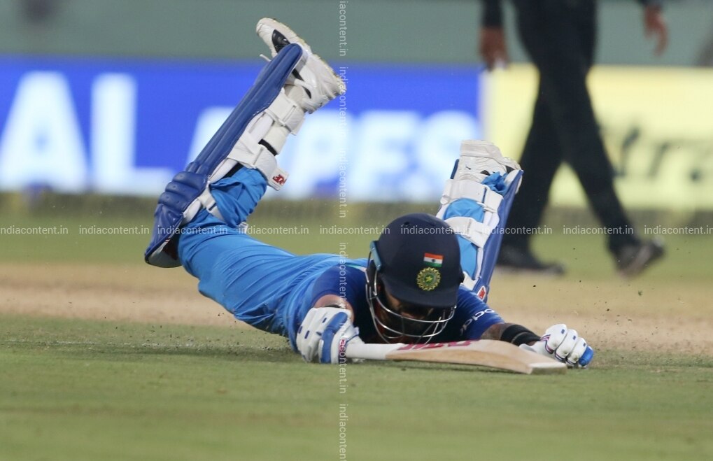 Buy Visakhapatnam Indian captain Virat Kohli slides into the crease after taking a run during the second ODI match between India and West Indies at Dr YS Rajasekhara Reddy ACA VDCA Cricket Stadium in Visakhapatnam on Oct 24 2018 Photo Surjeet Ya Pictures, Images, Photos By IANS - Sports pictures