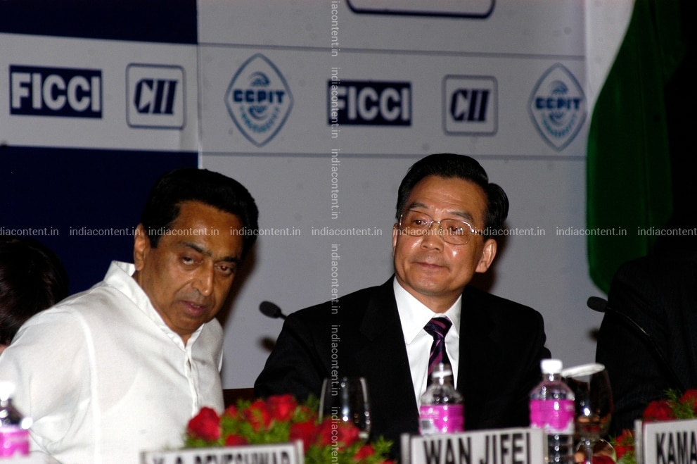 Chinese Prime Minister Wen Jiabao R with Union minister of trade and commerce India Kamal Nath L on diasat the conference on Indo China business ties and prosperity at the conference organised by the Indian business organisations like FICCI and CII in New Delhi India on 11 April 2005 during his four days visit to IndiaTogether Sitting