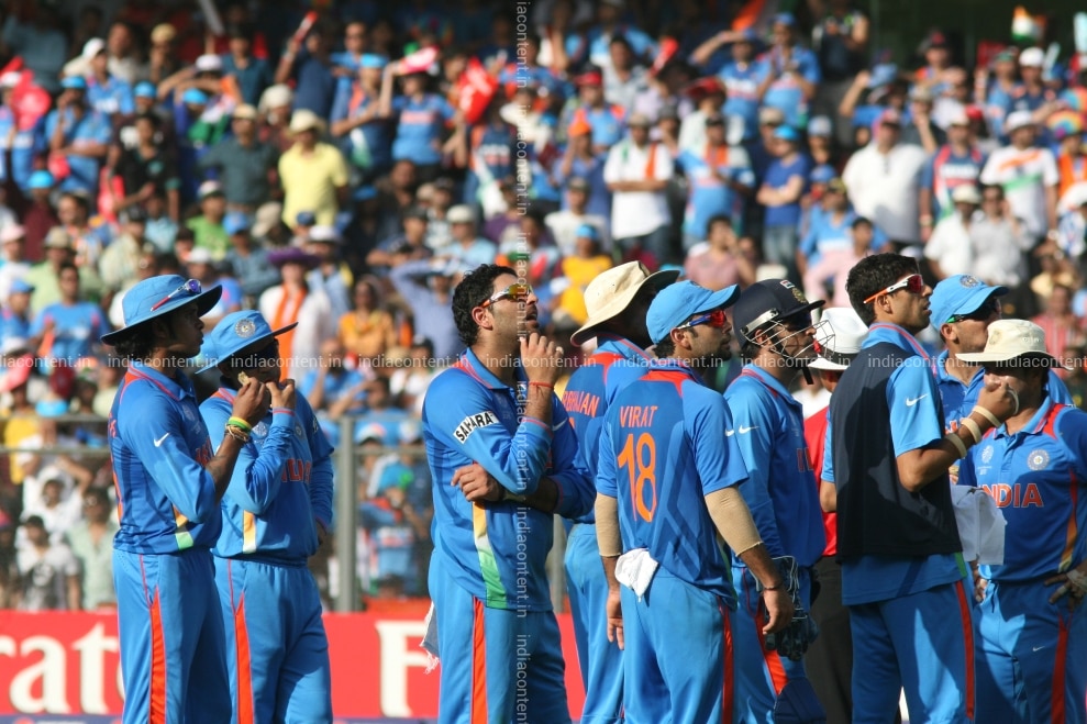 MUMBAI INDIA APRIL 02 Team India players watching the giant screen for third umpires decision during the World Cup final match at Wankhade Stadium in Mumbai on Saturday April 2 2011.Photo by Bhaskar Paul India Today Group